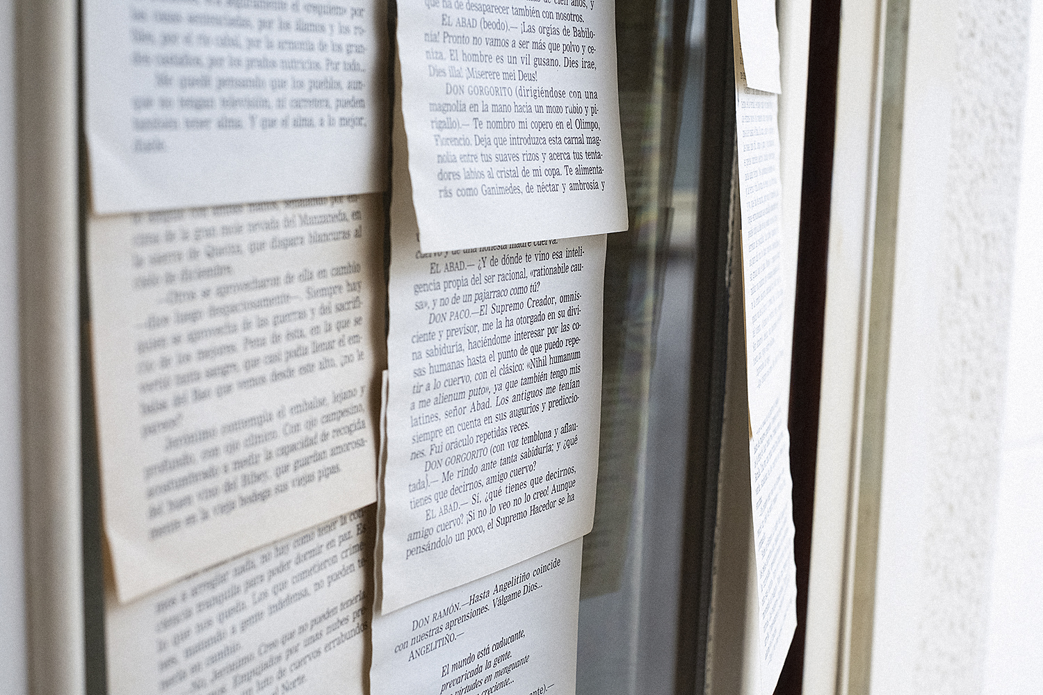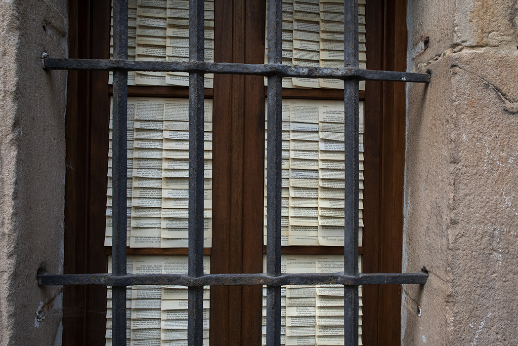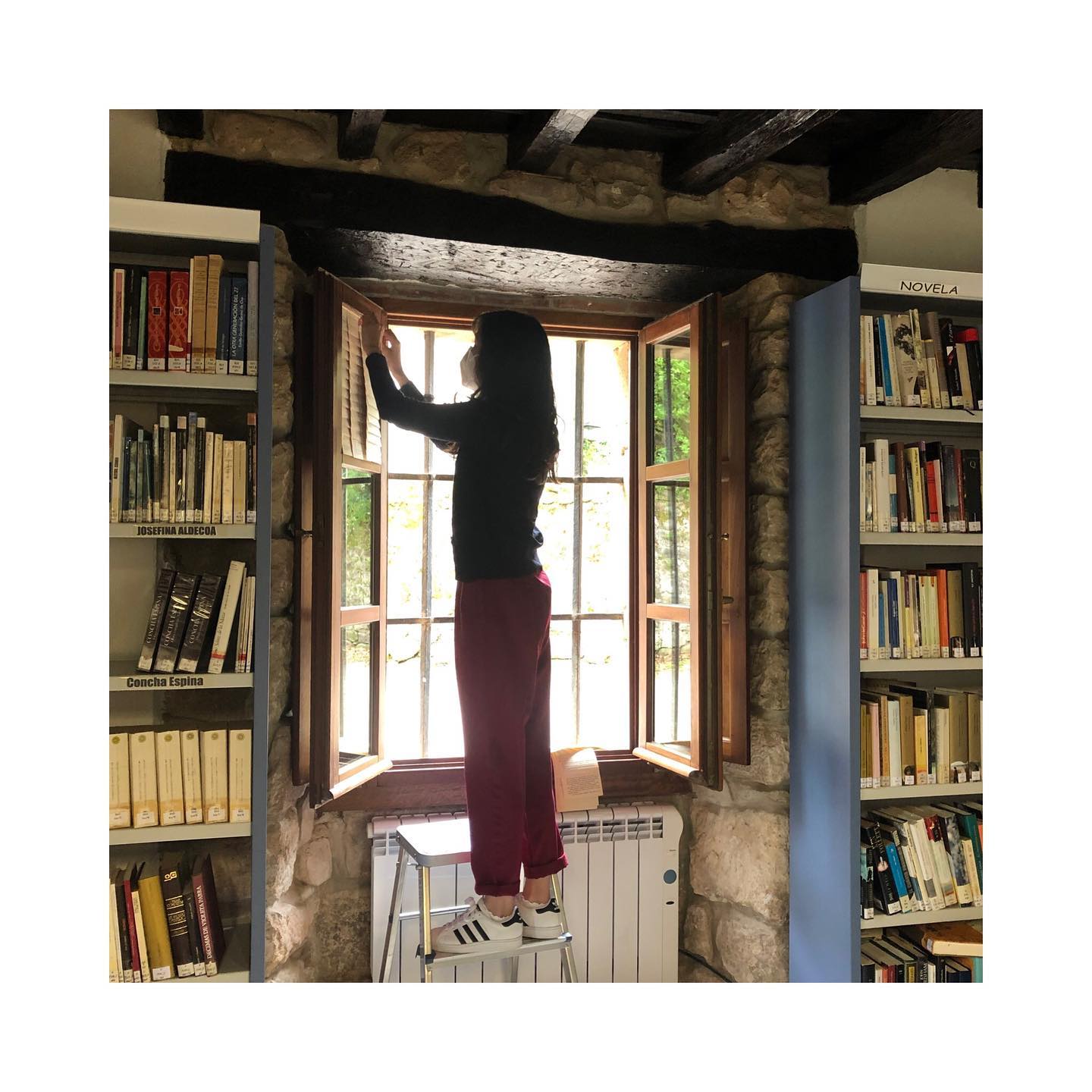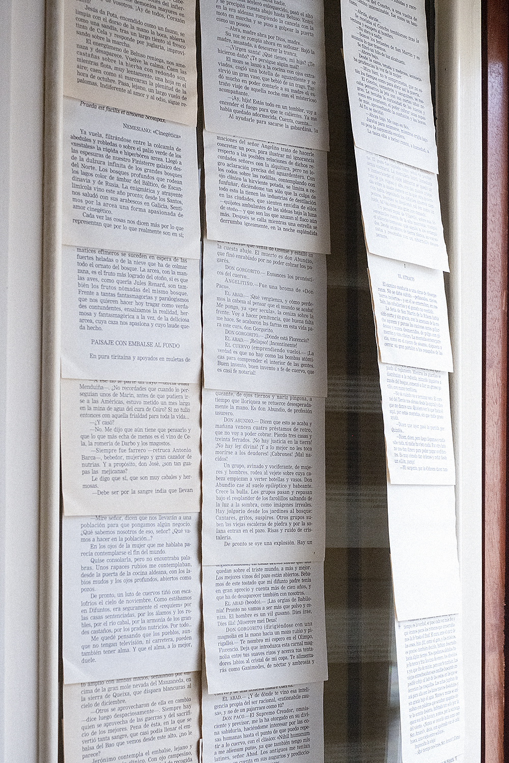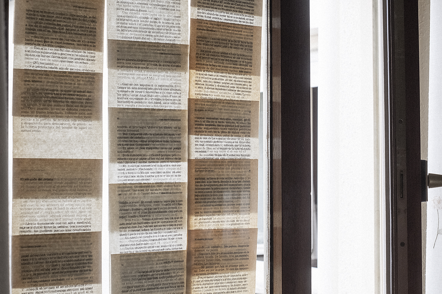 En las letras no leídas cientos de páginas de libros visten las ventanas de la biblioteca de Mazcuerras que, como tantas otras, se vio obligada a cerrar sus puertas como consecuencia de la situación epidemiológica que nos ha tocado vivir. De este modo, las ventanas del edificio se cubren con persianas de páginas, con aquellas lecturas que se podrían haber hecho en ella y que quedaron pendientes para otro momento u otro lugar.