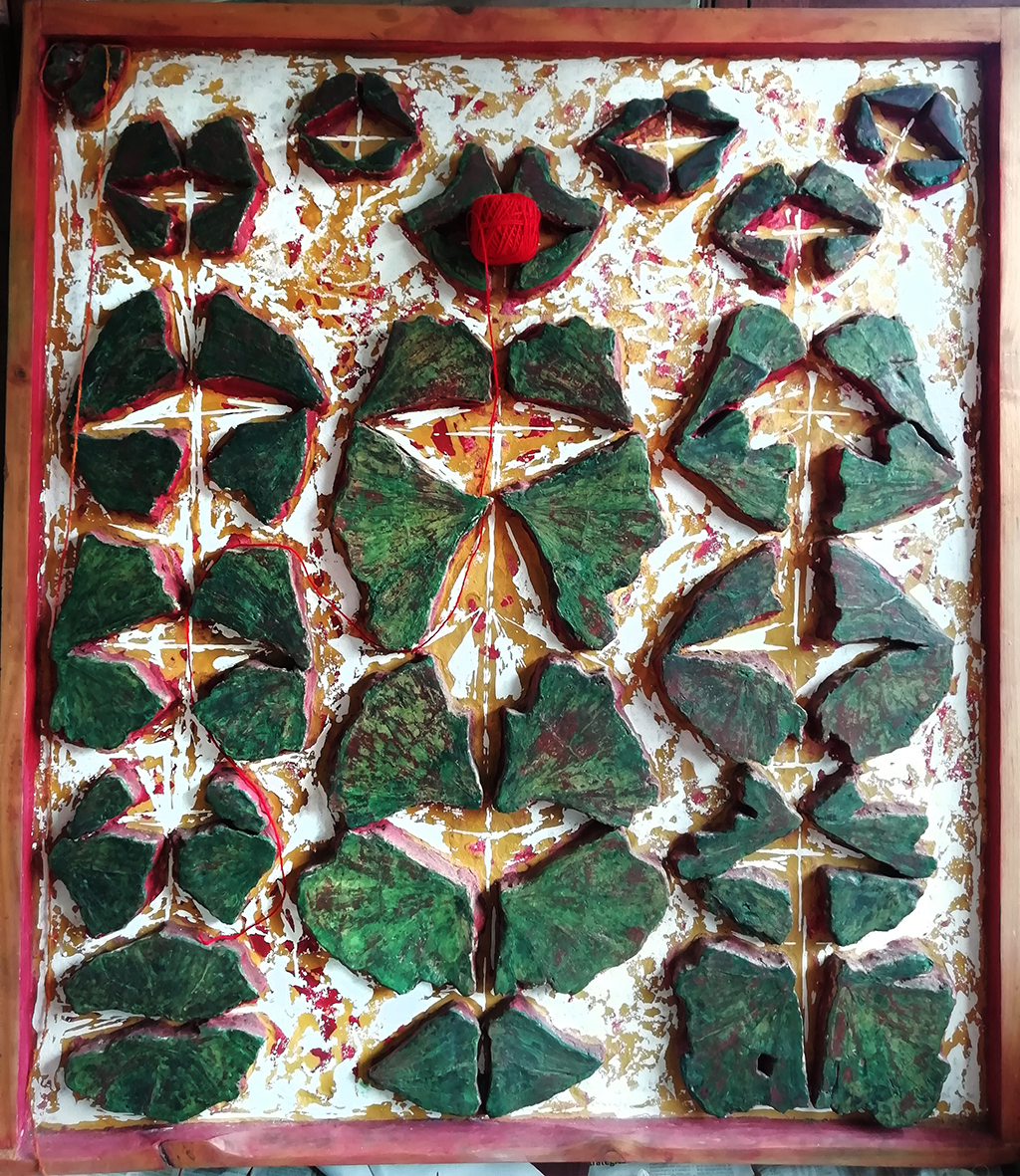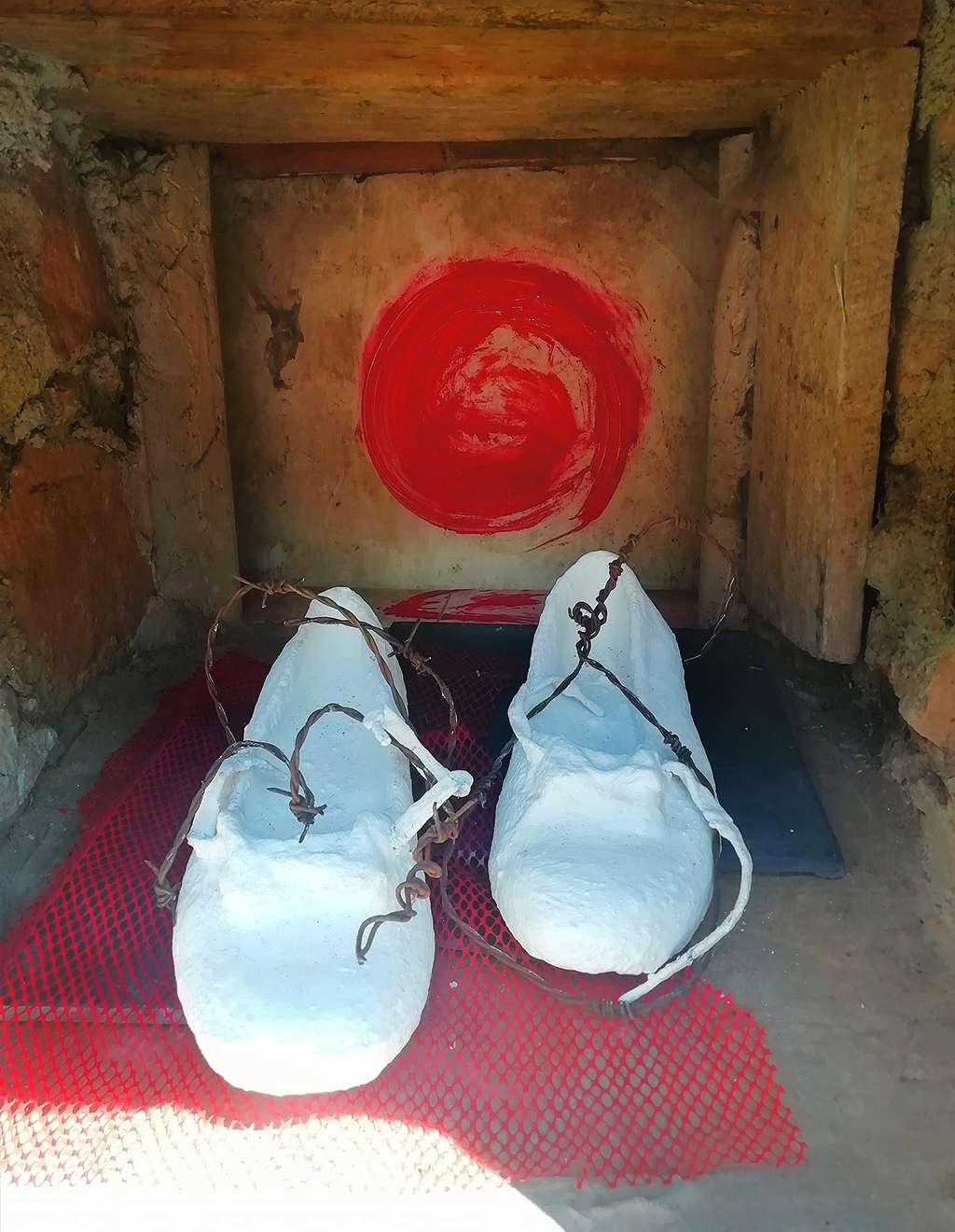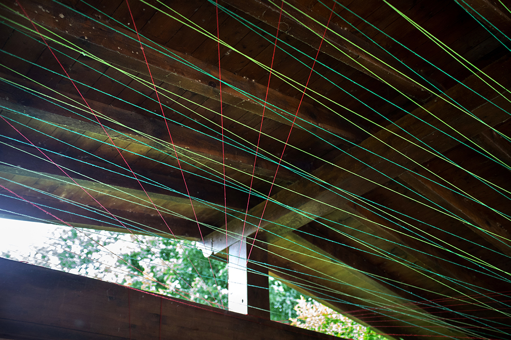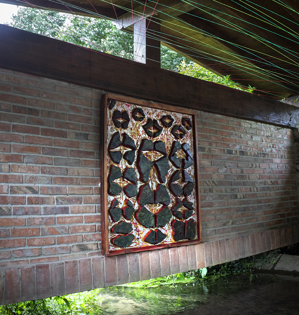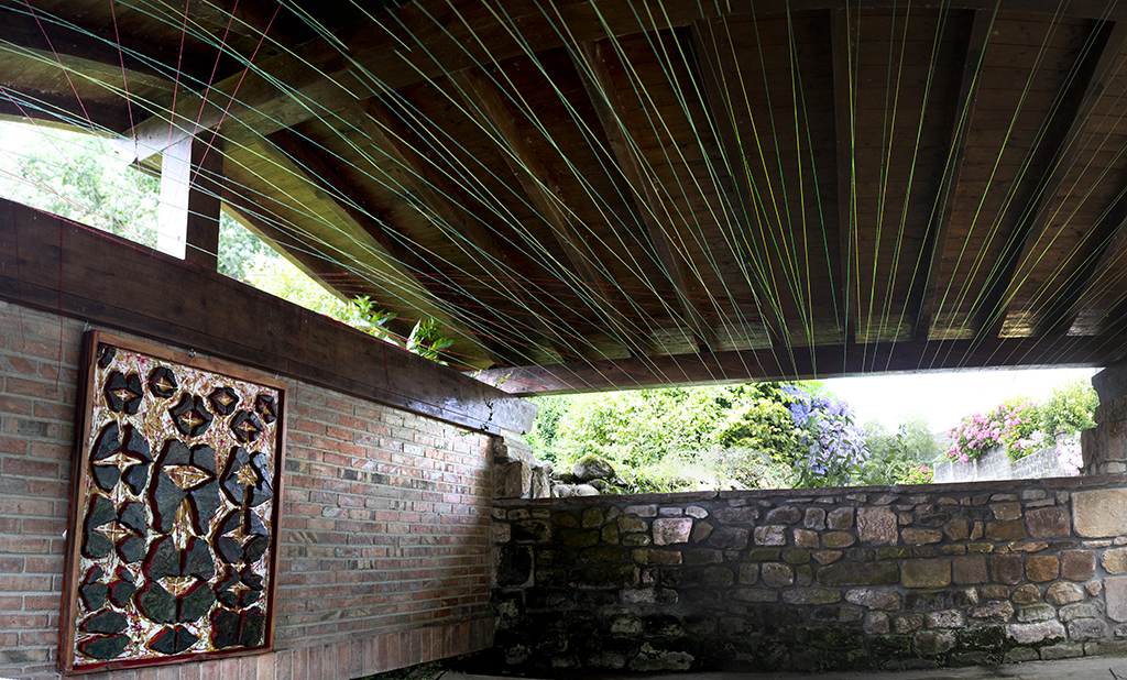MURMURACIONES:. Ubicación en el lavadero de Mazcuerras. Cuadro de madera y poliuretano. Instalación de un techo de hilos de color.