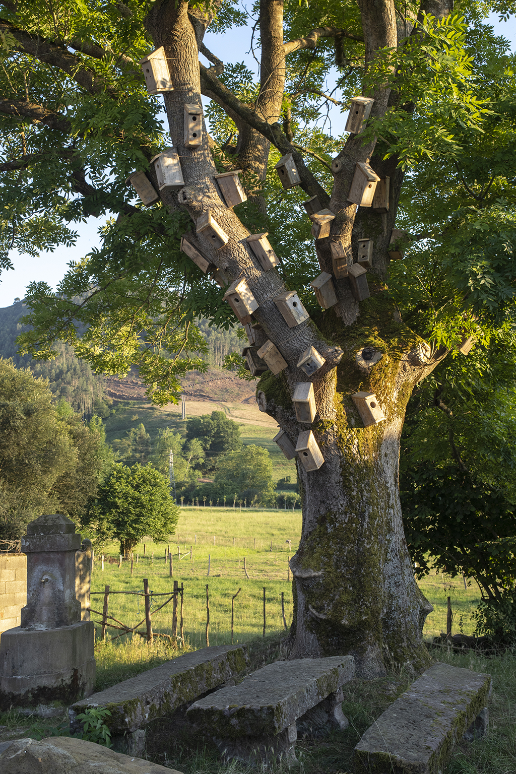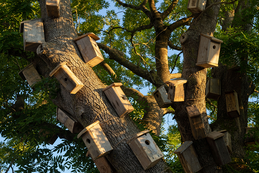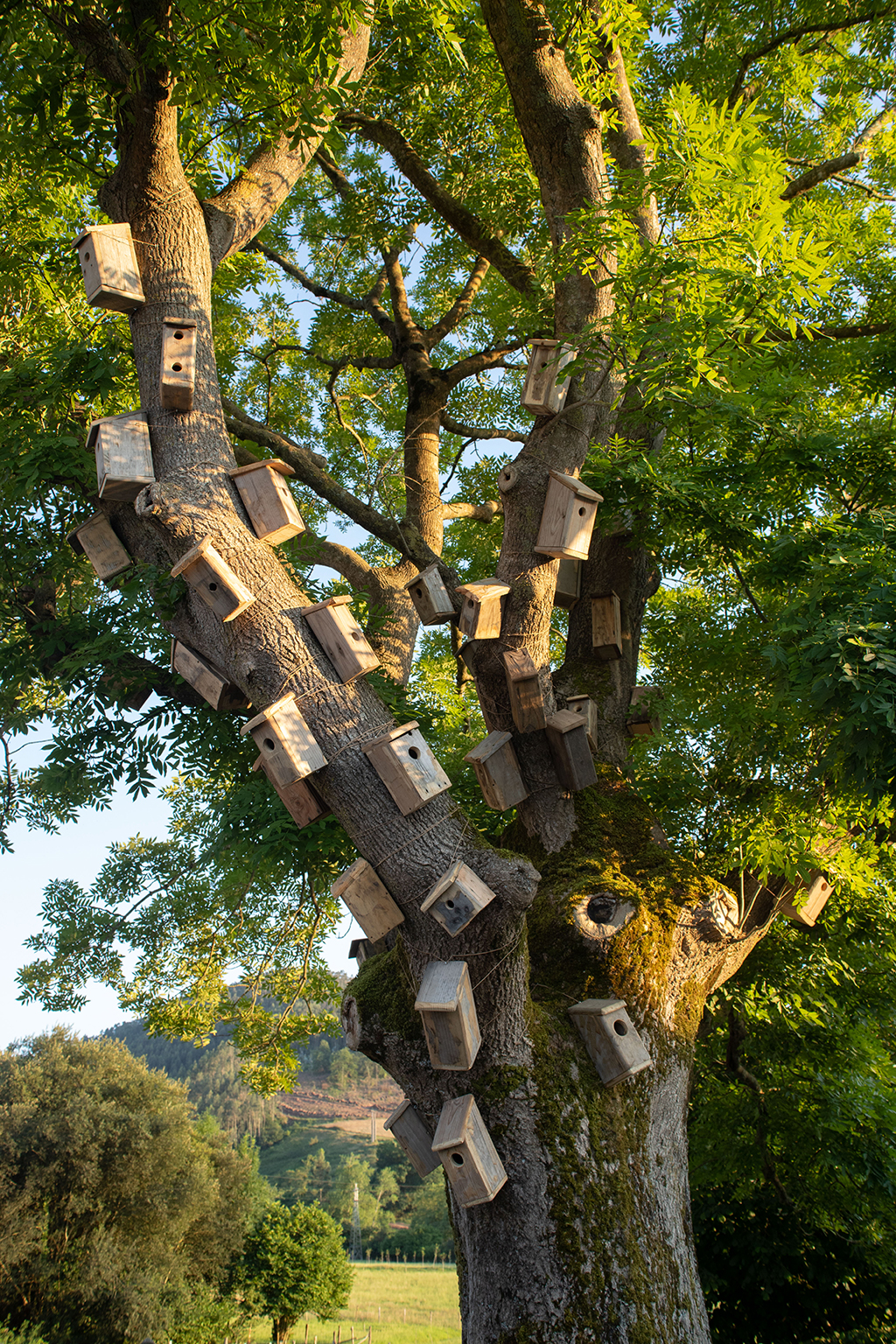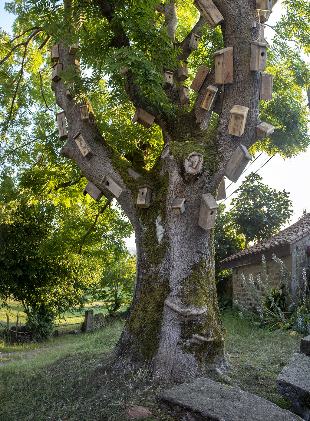 Revestir un roble con cajas nido es, por un lado, humanizar un árbol y hacer una llamada a la fauna silvestre para que se instale allí. Por otra lado, es evidenciar la necesidad de organización y control del entorno. Pero, a pesar de ello, las aves no entienden nuestros límites: tarde o temprano o se aprovechan o se adaptan a este nuevo entorno. Ellas tienen sus propios códigos y sus actos responden a lo esencial, la supervivencia. El refugio, el hogar, la zona de confort, forman parte de un paso más hacia el bienestar. Y este paralelismo aparece también en nosotros, manifestado por alguna casita sin apertura para el albergue animal. Esto hace referencia al mundo contemporáneo, concretamente a la actualidad: no hay refugio para todos y aunque pueda vislumbrarse, el acceso no es posible.