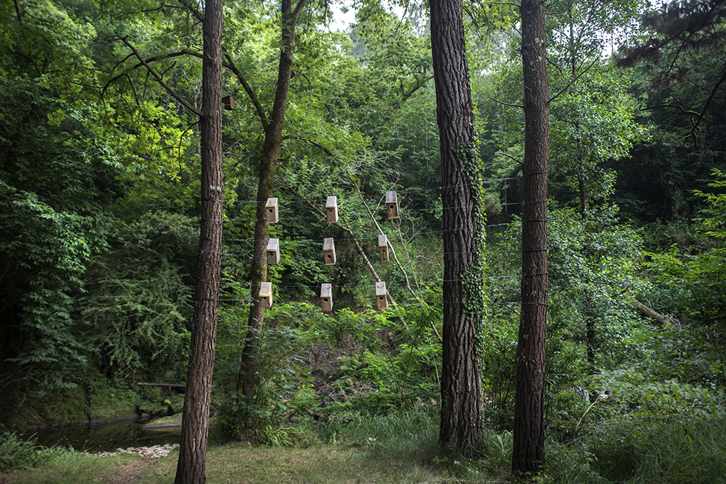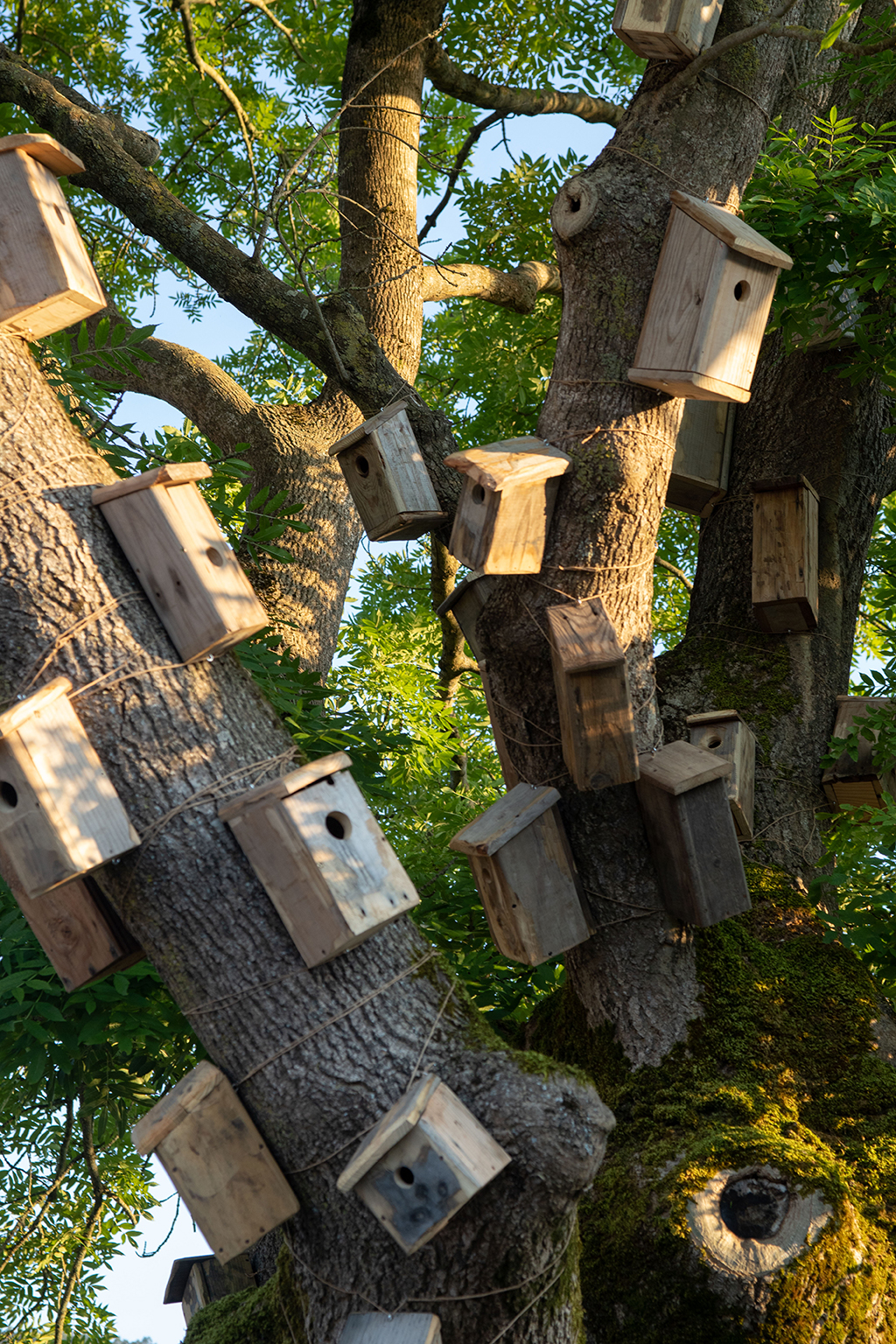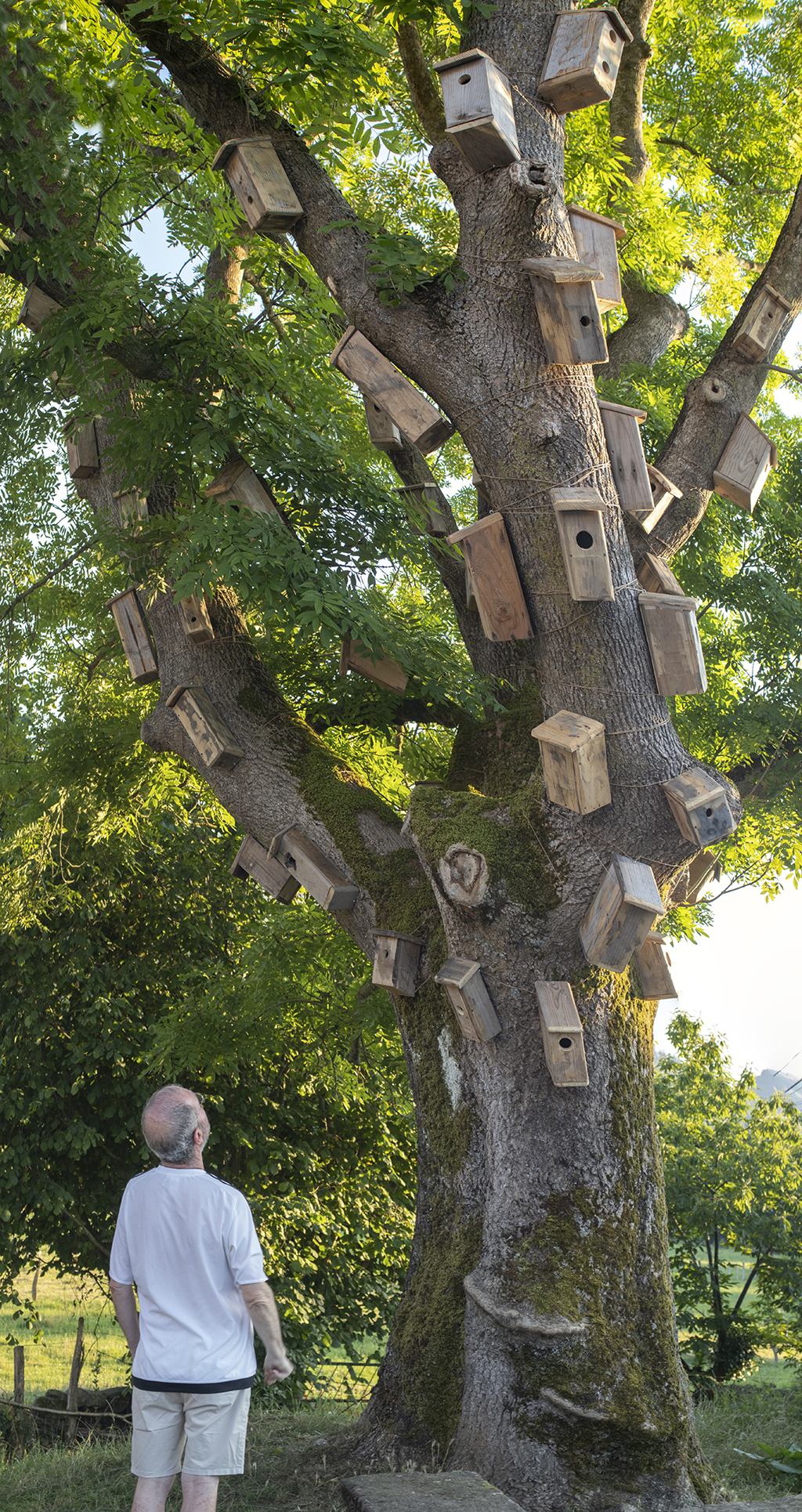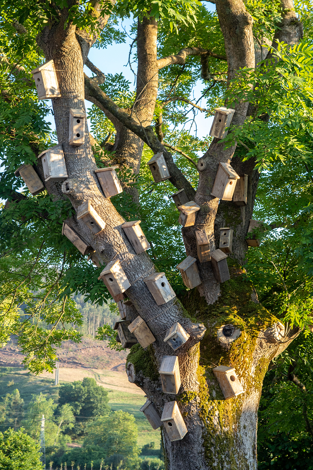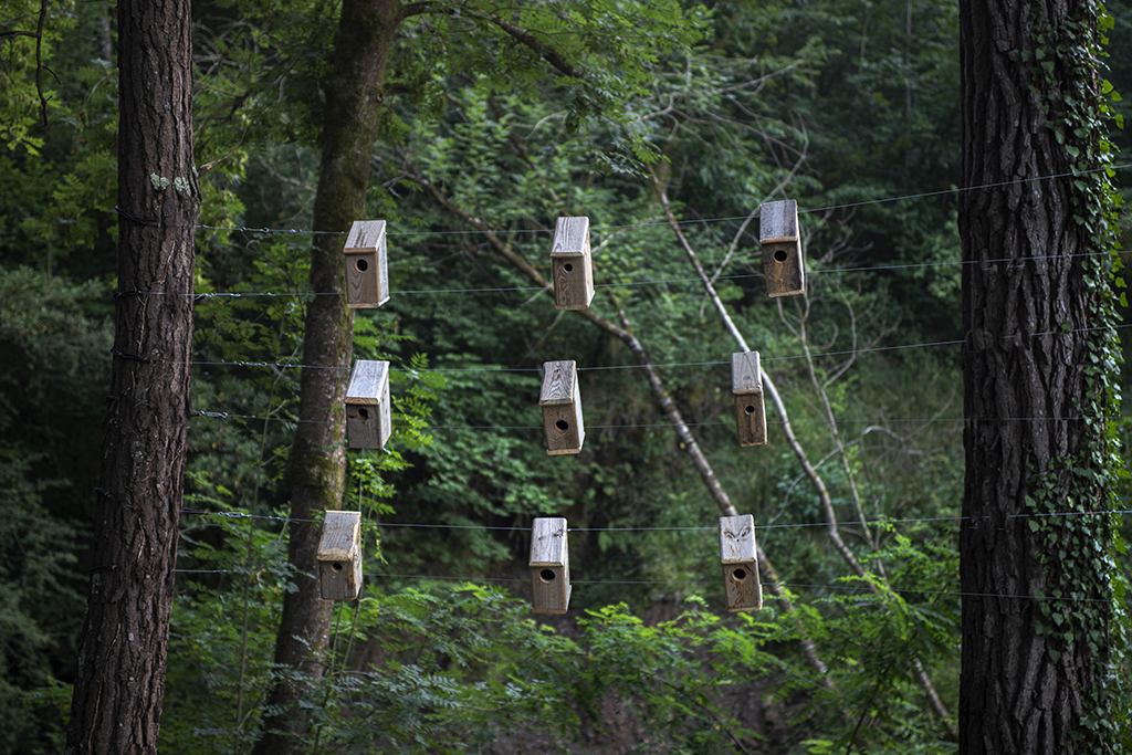 Revestir un roble con cajas nido es, por un lado, humanizar un árbol y hacer una llamada a la fauna silvestre para que se instale allí. Por otra lado, es evidenciar la necesidad de organización y control del entorno. Pero, a pesar de ello, las aves no entienden nuestros límites: tarde o temprano o se aprovechan o se adaptan a este nuevo entorno. Ellas tienen sus propios códigos y sus actos responden a lo esencial, la supervivencia. El refugio, el hogar, la zona de confort, forman parte de un paso más hacia el bienestar. Y este paralelismo aparece también en nosotros, manifestado por alguna casita sin apertura para el albergue animal. Esto hace referencia al mundo contemporáneo, concretamente a la actualidad: no hay refugio para todos y aunque pueda vislumbrarse, el acceso no es posible.