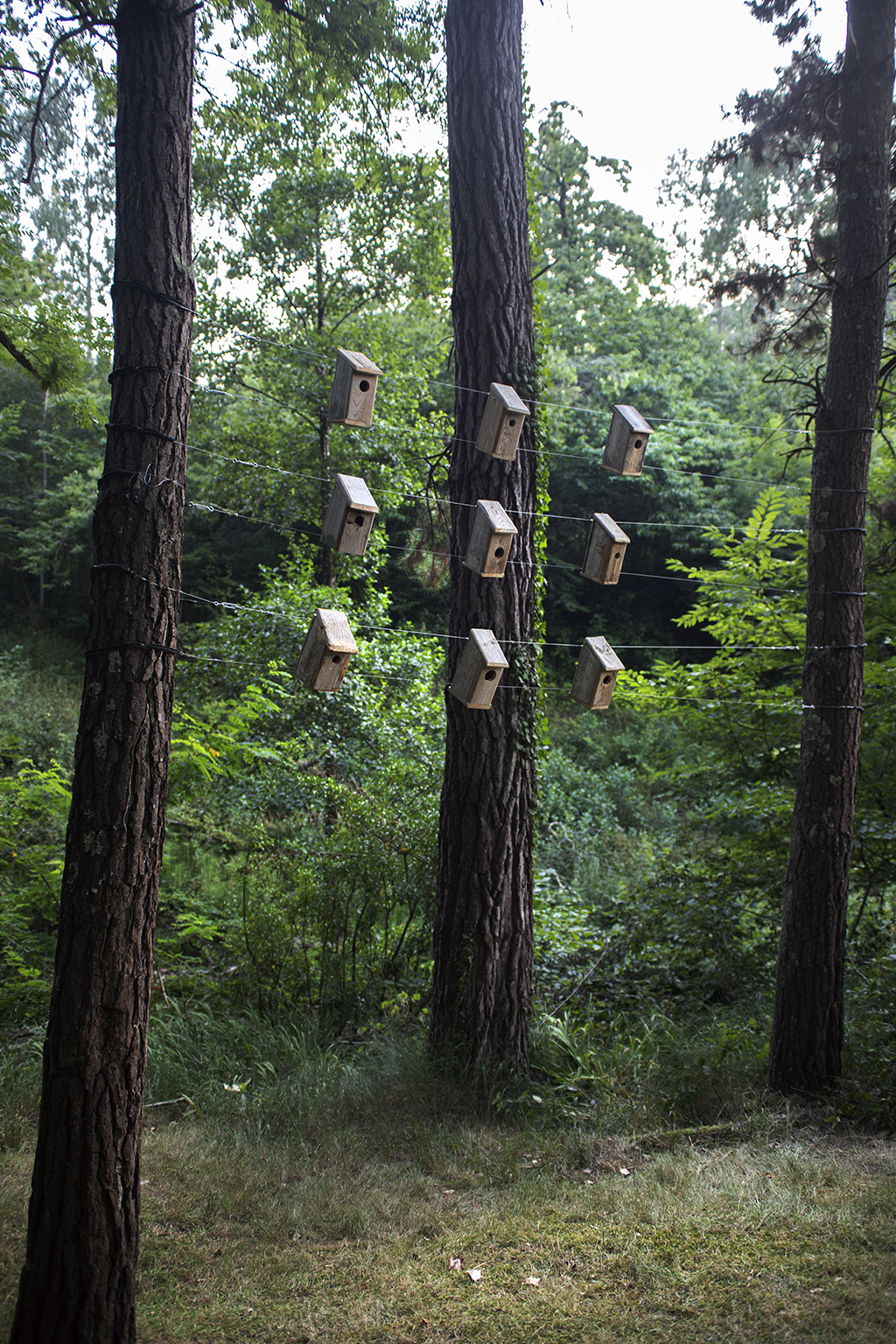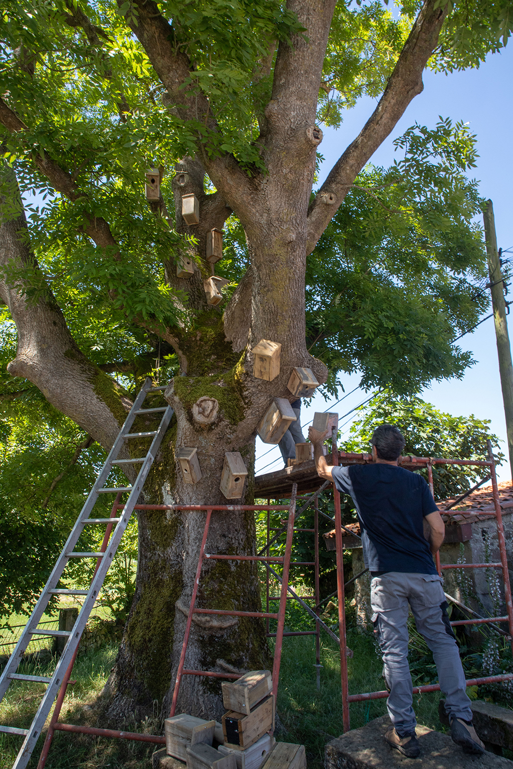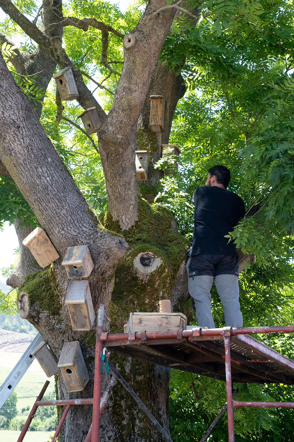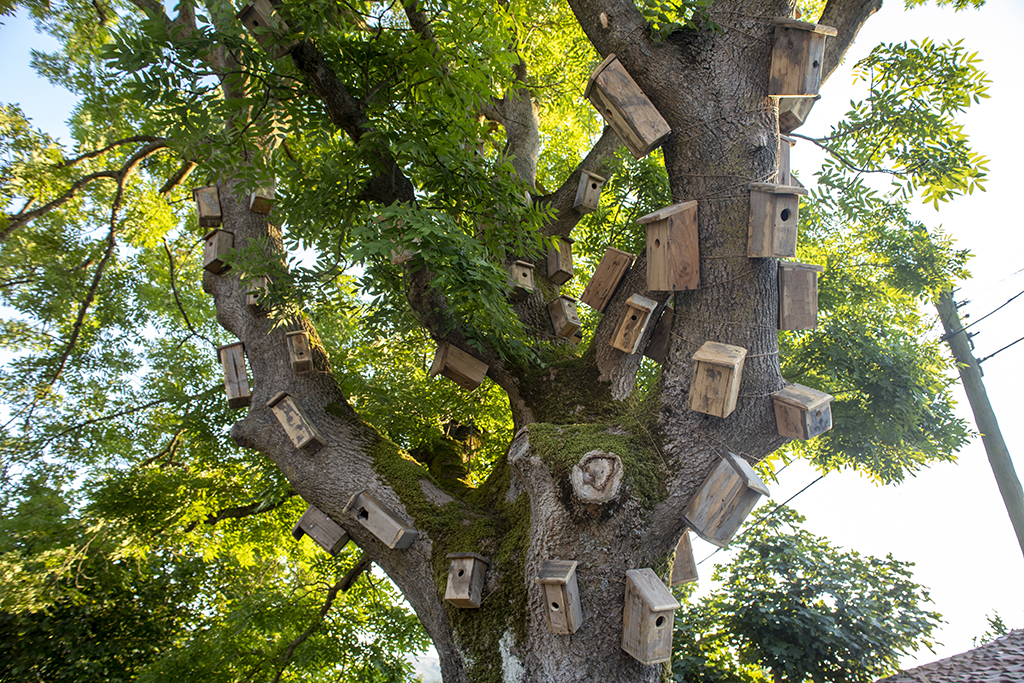 Revestir un roble con cajas nido es, por un lado, humanizar un árbol y hacer una llamada a la fauna silvestre para que se instale allí. Por otra lado, es evidenciar la necesidad de organización y control del entorno. Pero, a pesar de ello, las aves no entienden nuestros límites: tarde o temprano o se aprovechan o se adaptan a este nuevo entorno. Ellas tienen sus propios códigos y sus actos responden a lo esencial, la supervivencia. El refugio, el hogar, la zona de confort, forman parte de un paso más hacia el bienestar. Y este paralelismo aparece también en nosotros, manifestado por alguna casita sin apertura para el albergue animal. Esto hace referencia al mundo contemporáneo, concretamente a la actualidad: no hay refugio para todos y aunque pueda vislumbrarse, el acceso no es posible.