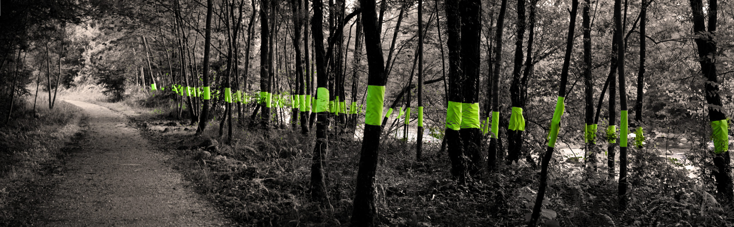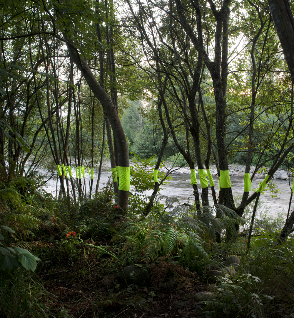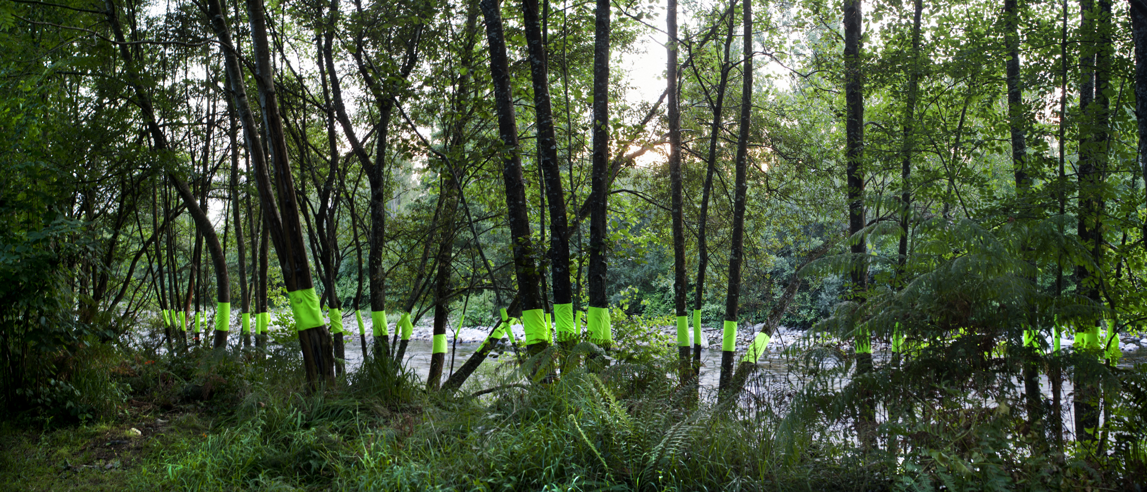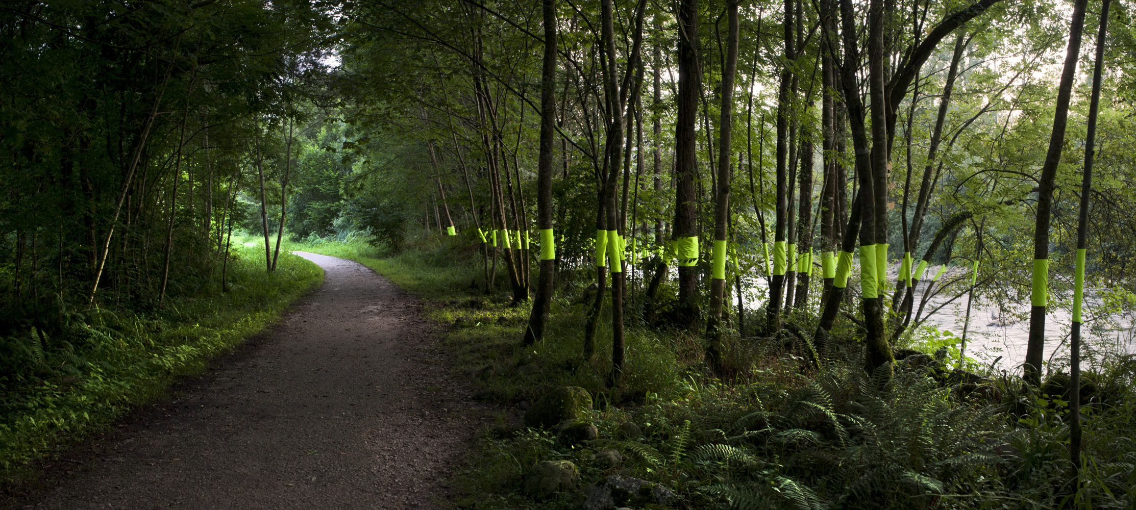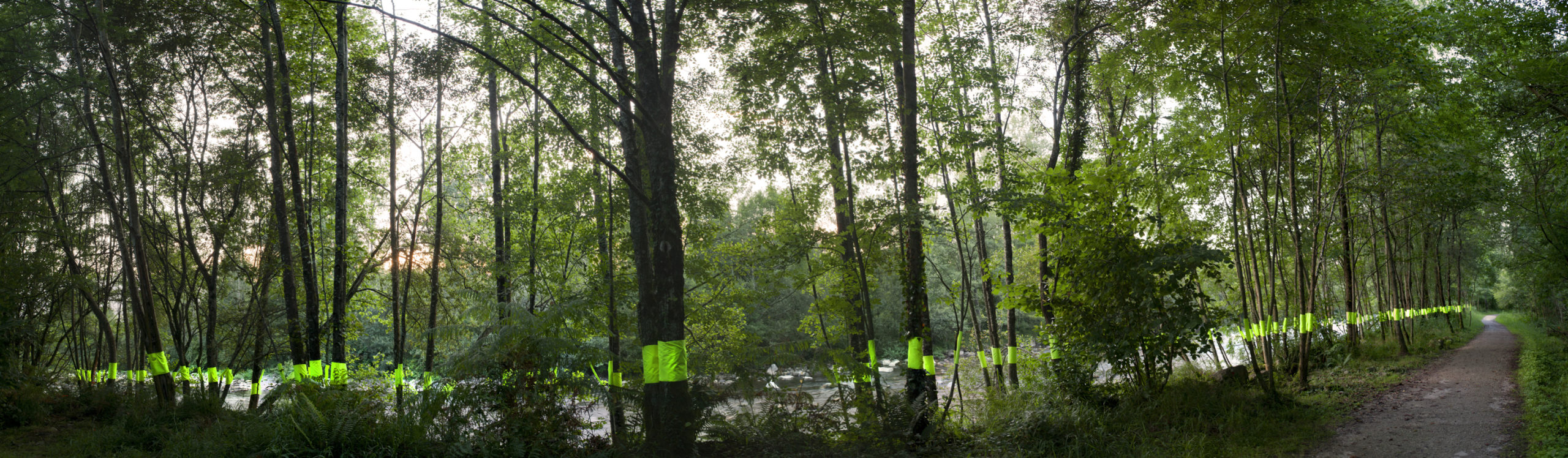 Combinar el agua, que percibimos por la luz que refleja a través de los árboles de ribera, con la luminiscencia del elemento textil incorporado a los troncos de los árboles, permite armonizar dos movimientos, dos flujos fundamentales para la vida: el agua y la luz.