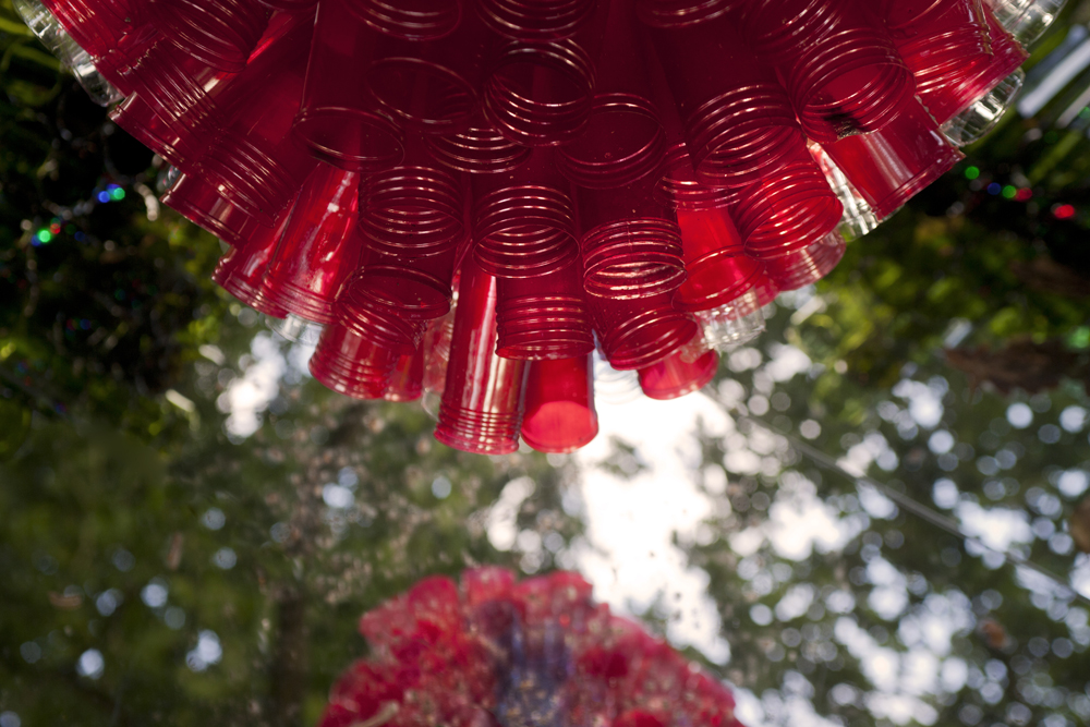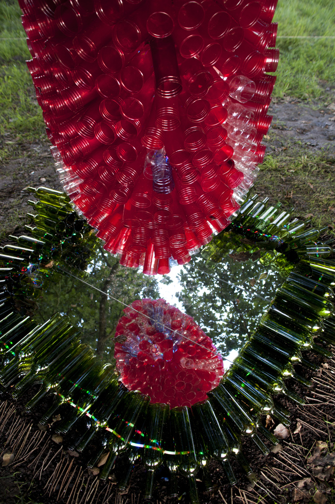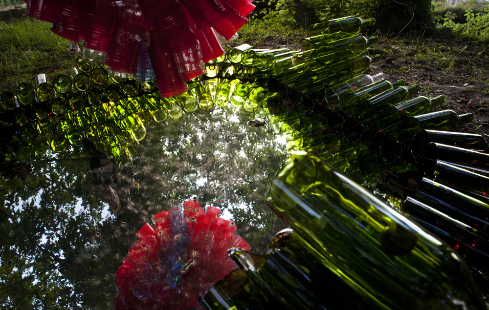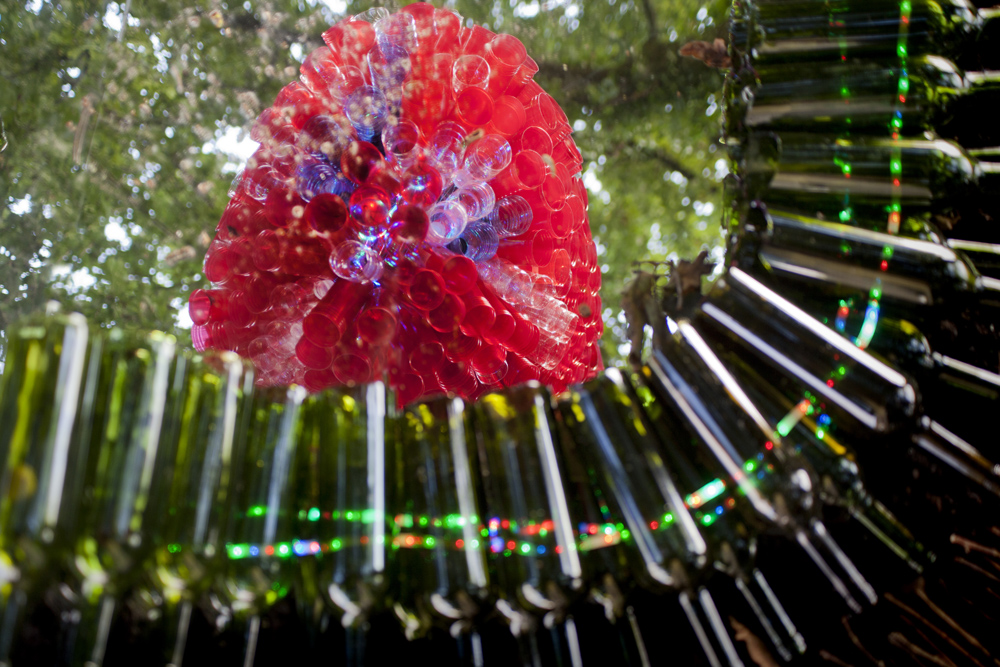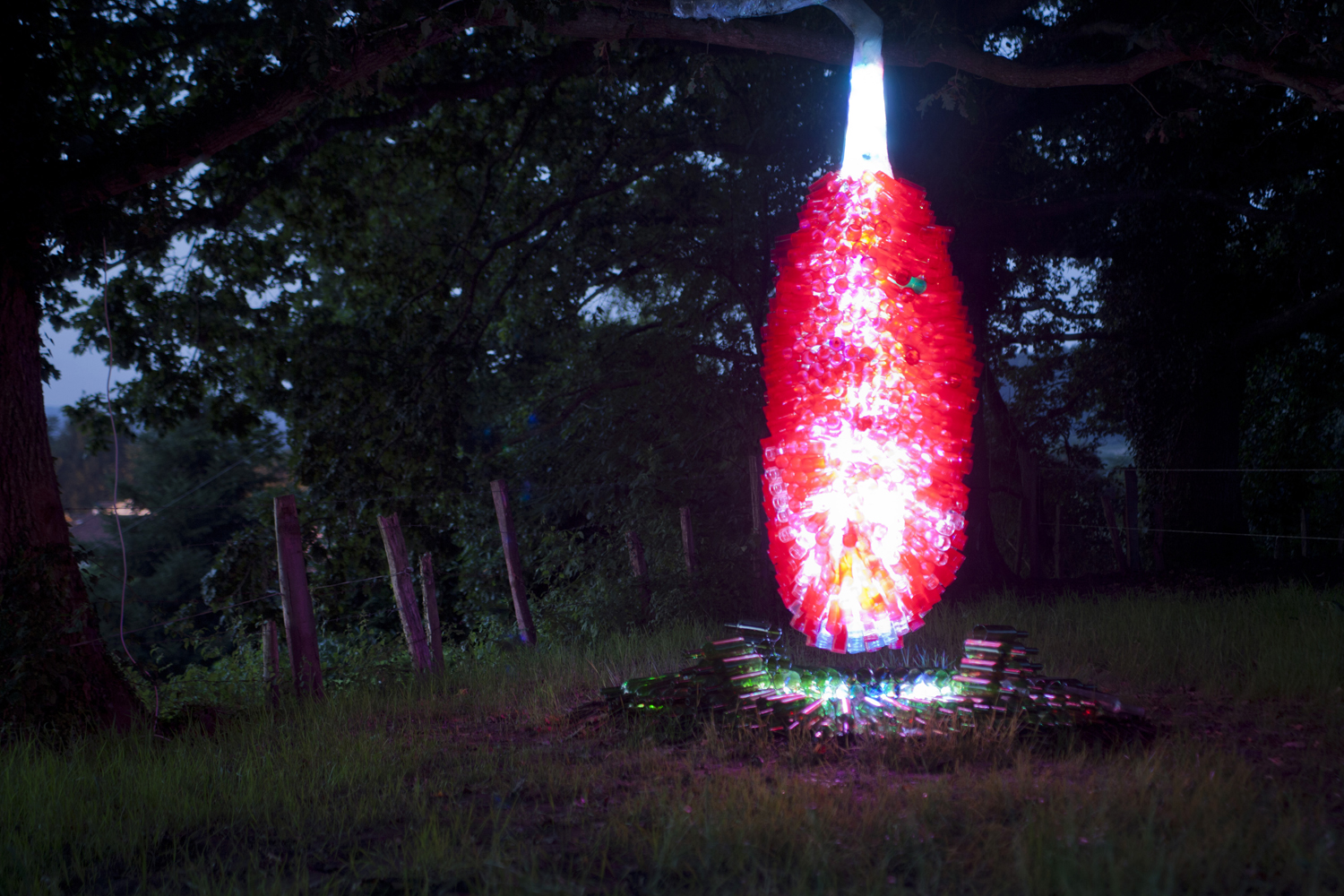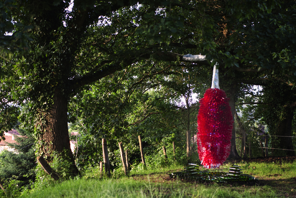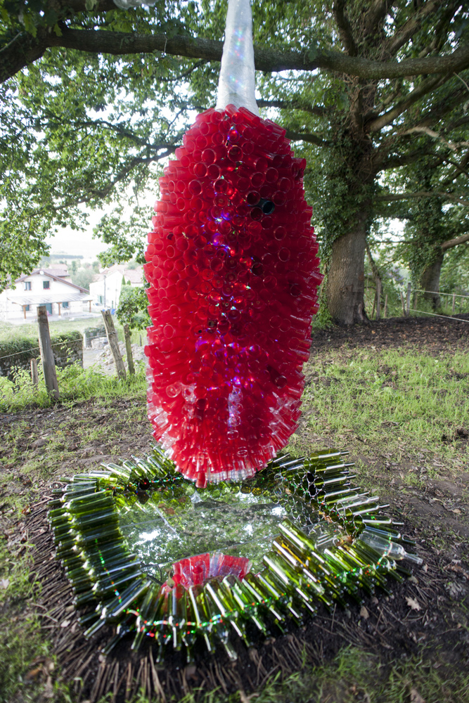 Nuestro querido Manín, nos ofrece una intervención colgada de un gran roble centenario, titulada «CRISÁLIDA», realizada, reciclando los envases de las luminarias que los peregrinos de las fiestas de la virgen del Carmen de su pueblo, Barcena de Villacarriedo, van ofreciendo en el culto. Quiere sugerirnos la unidad de todos en la superación de los problemas que acarreamos y que afectan a la naturaleza y a la globalidad de la vida.