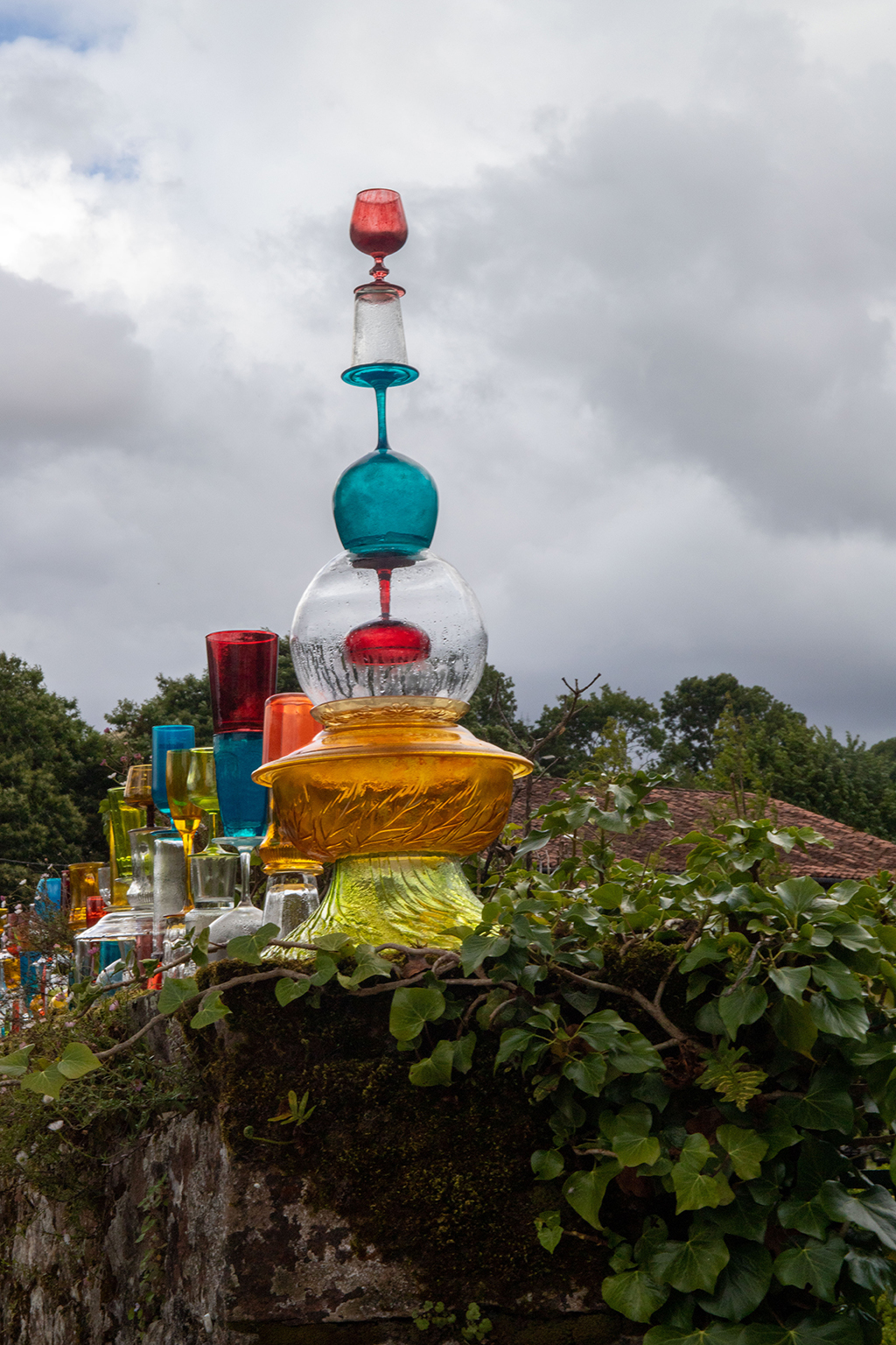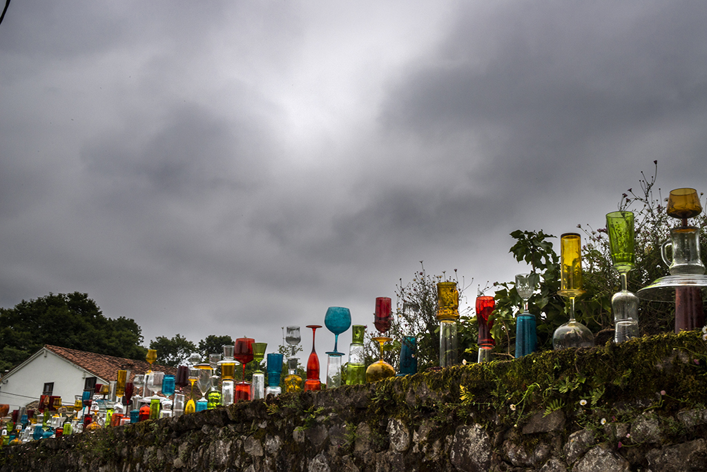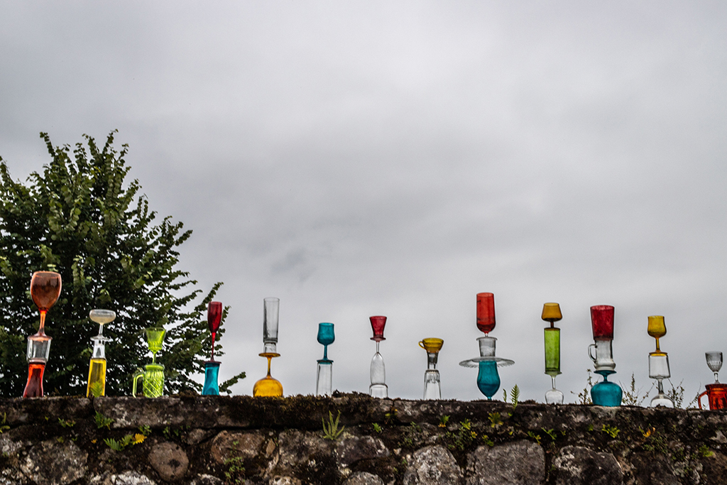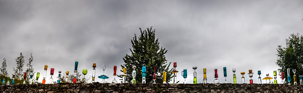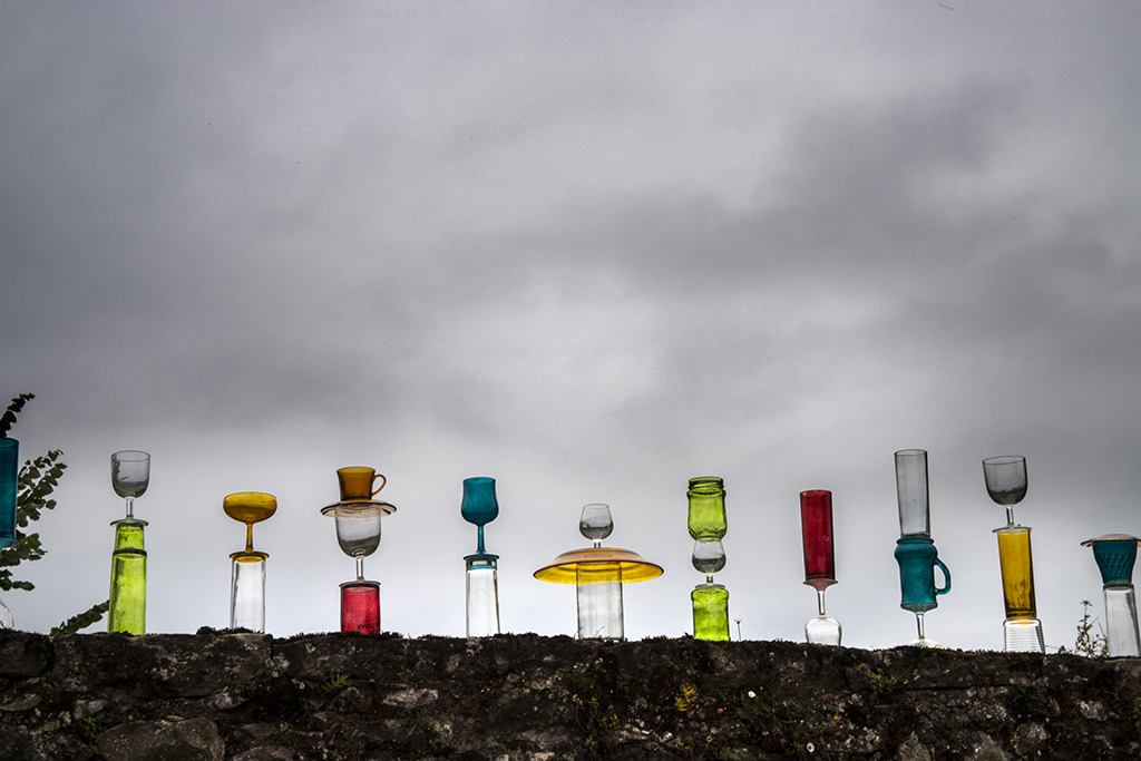 El colectivo YOMUTO, formado por Federico Tosco Yomuto e Isis Míriam Navarro, nos presentan en la Plaza de la Castañera sobre el muro de los Viveros Escalante una instalación de 104 totems, que está hecha con materiales reutilizados de vidrio: copas, vasos y platos recogidos por la gente local. Simples objetos cotidianos, que organizados en nuevas formas tienen una nueva identidad, con una belleza mutable y transitoria como la del entorno.