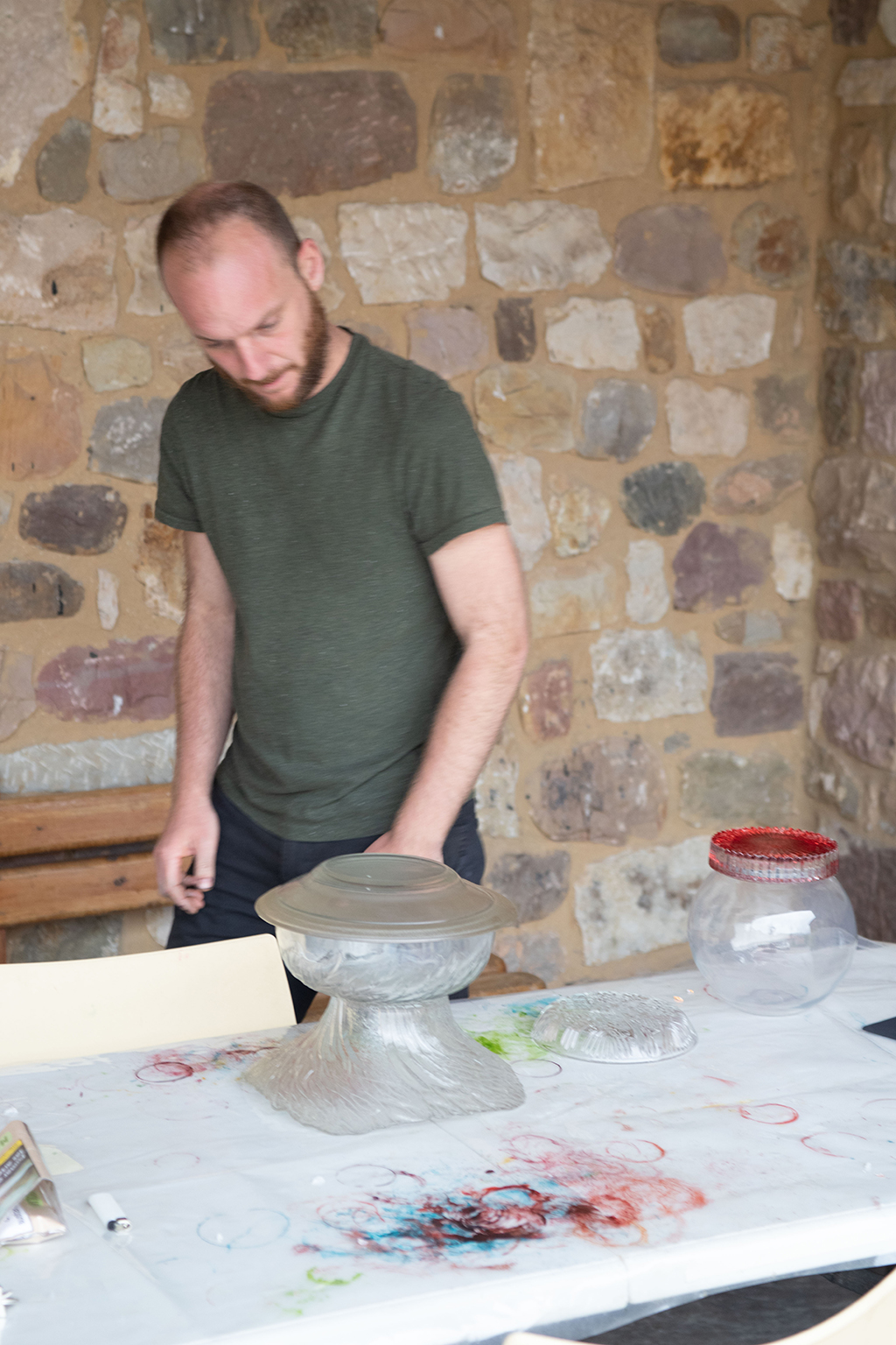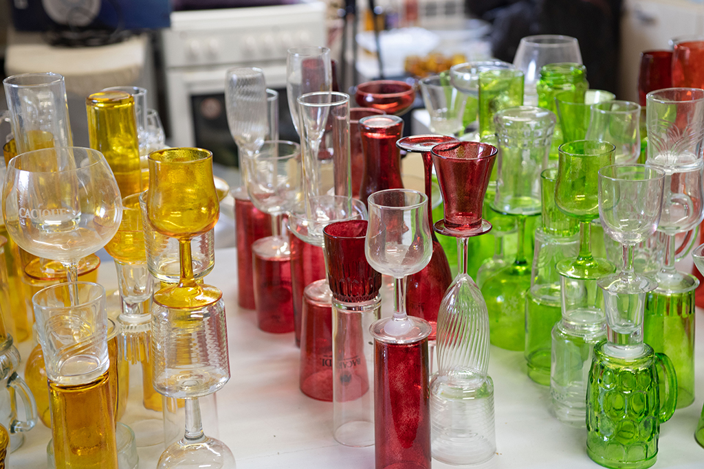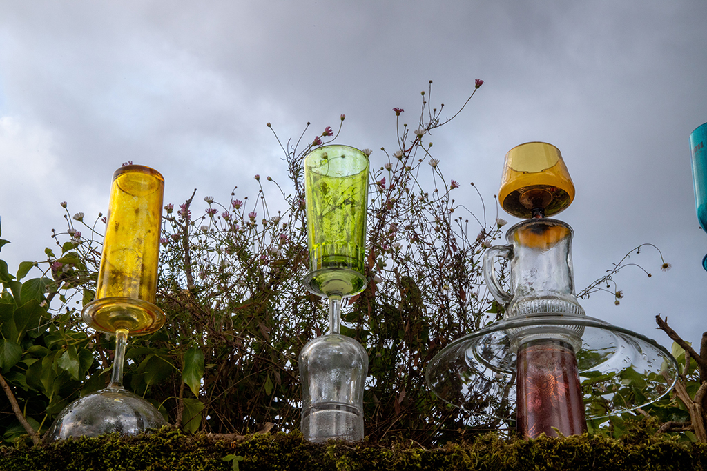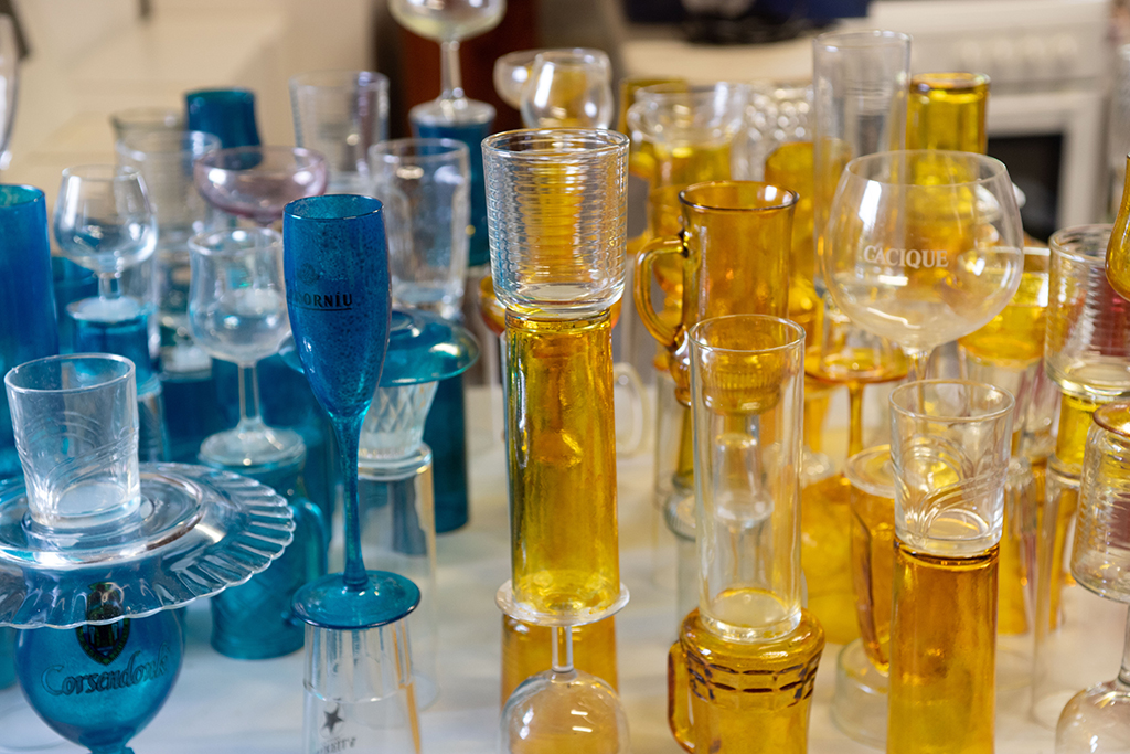 El colectivo YOMUTO, formado por Federico Tosco Yomuto e Isis Míriam Navarro, nos presentan en la Plaza de la Castañera sobre el muro de los Viveros Escalante una instalación de 104 totems, que está hecha con materiales reutilizados de vidrio: copas, vasos y platos recogidos por la gente local. Simples objetos cotidianos, que organizados en nuevas formas tienen una nueva identidad, con una belleza mutable y transitoria como la del entorno.